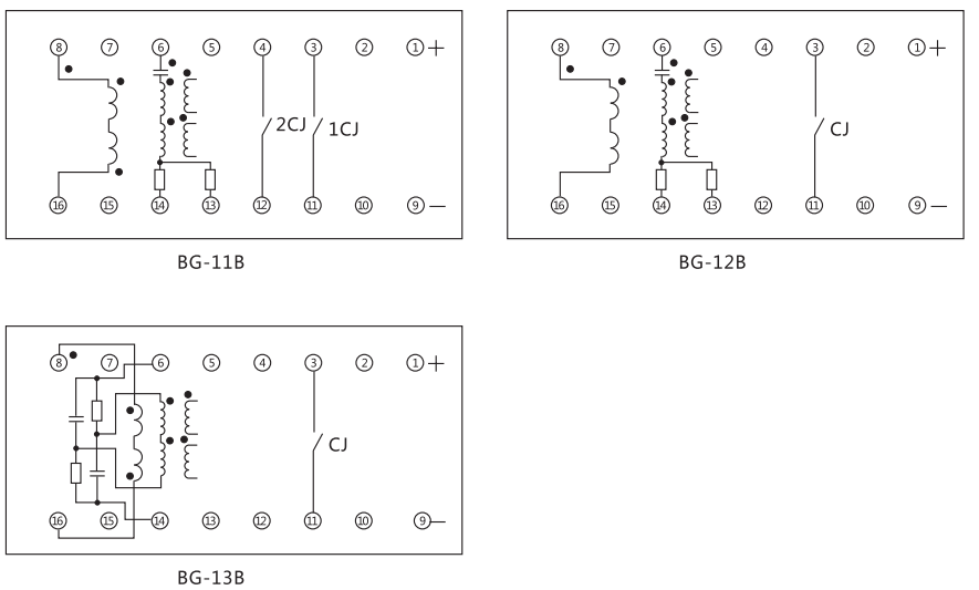BG-11B功率繼電器(以下簡稱繼電器)應(yīng)用于電力系統(tǒng)方向保護接線中,作為功率方向元件。其中BG-12B用于相間短路保護; BG-13B用于接地保護; BG-11B是具有雙方向觸點的功率元件, 用于平行線路橫聯(lián)差動保護中。
