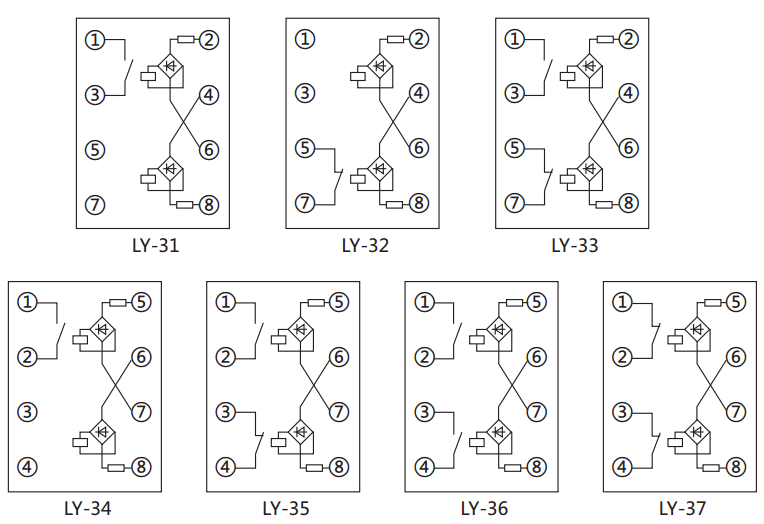 LY-36電壓繼電器內(nèi)部接線(xiàn)及外引接線(xiàn)圖(正視圖)