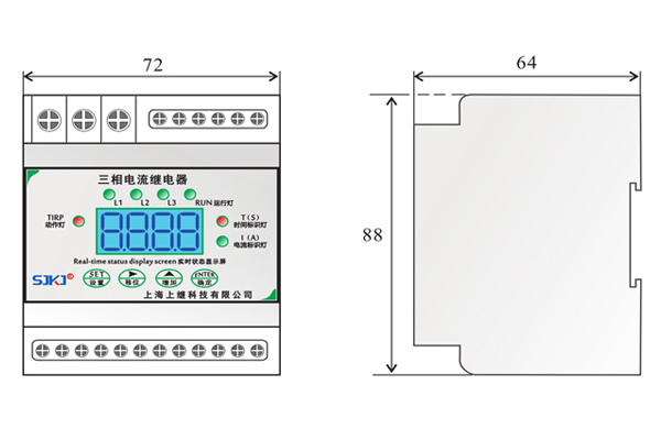 當(dāng)繼電器2、3端子接入工作電源時(shí),數(shù)碼管顯示當(dāng)前輸入的實(shí)時(shí)電流。長按SET設(shè)置鍵1秒,便進(jìn)入L1電流整定值,可以通過移位鍵和增加鍵設(shè)定所需的電流值,改動(dòng)的數(shù)碼管會(huì)閃爍,允許修改。再按一下SET設(shè)置鍵,此時(shí)時(shí)間標(biāo)識(shí)燈點(diǎn)亮,顯示為L1電流所需的延時(shí)值,也通過移位鍵和增加鍵設(shè)定所需的時(shí)間值。然后再按SET設(shè)置鍵,進(jìn)入設(shè)置L2電流整定值,設(shè)定的方法和前面設(shè)定一樣及L3電流同樣如上設(shè)置。均設(shè)置好后,再按SET設(shè)置鍵界面會(huì)進(jìn)入三相電流各相所需投入使用還是退出。比如只要A、C相工作,B相退出,通過移位鍵將按至B字母位置,按下增加鍵,當(dāng)數(shù)碼管顯示時(shí),說明該相已經(jīng)退出運(yùn)行。需要三相均有輸出工作,可以工作增加鍵將相序字母點(diǎn)亮。跳過相序字母顯示頁面,來到過量、欠量方式選擇頁面,可根據(jù)自己所需通過增加鍵來設(shè)定,0代表欠量(欠流),1代表過量(過流)。完全設(shè)定好后,可以按ENTER確定鍵快速退出。也可以通過繼電器自動(dòng)5秒后退出,所設(shè)置參數(shù)自動(dòng)保存。退出時(shí)顯示實(shí)時(shí)電流和所投入的相來回切換數(shù)值。若有個(gè)別參數(shù)設(shè)定,可以在設(shè)置好后,直接按ENTER確定鍵快讀保存并退出。所需投入的相,指示燈會(huì)點(diǎn)亮,會(huì)顯示當(dāng)時(shí)實(shí)時(shí)的電流數(shù)值,未投入的相燈也會(huì)燈亮,顯示會(huì)是, 無數(shù)值顯示。繼電器達(dá)到所設(shè)定值,動(dòng)作后,由TIRP動(dòng)作燈會(huì)點(diǎn)亮,實(shí)際線路電流低于或高于所設(shè)定的返回值,指示燈切換回來。正常運(yùn)行情況下,RUN運(yùn)行燈、電流設(shè)置表示燈常亮。L1、L2、L3來回切換運(yùn)行。當(dāng)輸入電流任意一相滿足動(dòng)作條件,繼電器動(dòng)作,電流標(biāo)識(shí)燈熄滅,表示延時(shí)時(shí)間已到動(dòng)作。當(dāng)輸入接近動(dòng)作條件時(shí),繼電器進(jìn)入動(dòng)作預(yù)備狀態(tài),所有芯片資源用來計(jì)算輸入值,一旦滿足條件,立即啟動(dòng)計(jì)時(shí),繼電器設(shè)有啟動(dòng)量連續(xù)判斷功能和突變量連續(xù)判斷功能,能夠有效迅速的判斷輸入值,并躲過短時(shí)干擾。
