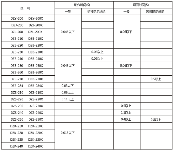 2.1動(dòng)作電壓與保持電壓不大于70%額定電壓, DZY(J)-201動(dòng)作電壓不大于80%額定電壓;動(dòng)作電壓不小于30%額定電壓, DZK-200及DZB 243不小于50%額定電壓。